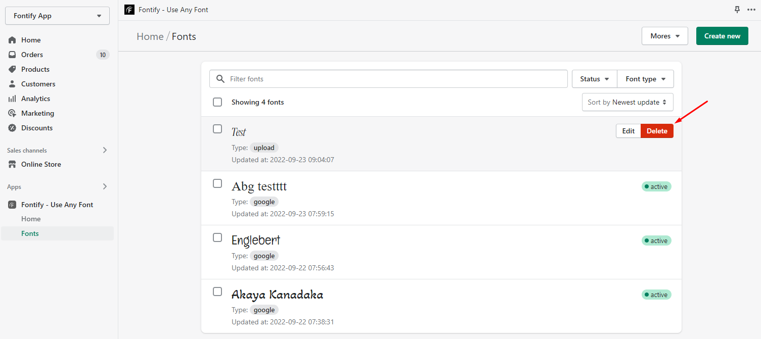 Step 1: Delete all fonts in the app. Go to the App dashboard -> Fonts -> Delete font.