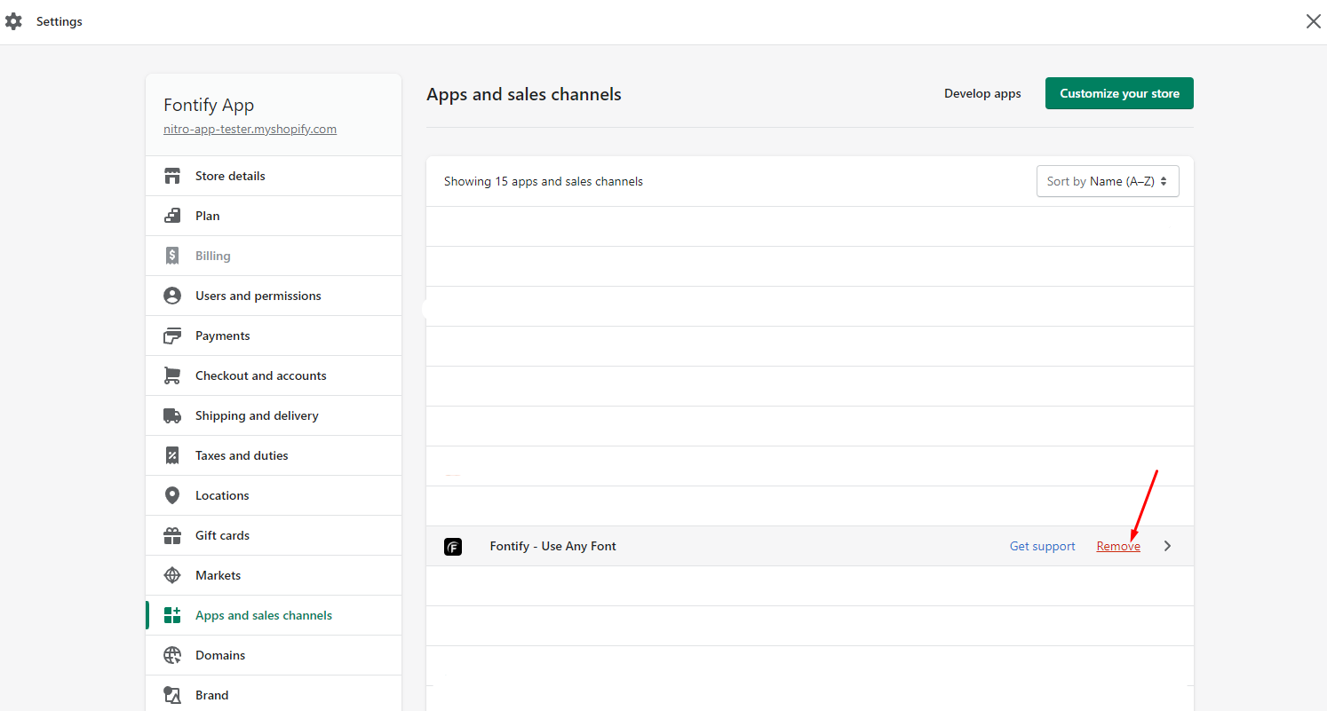 Step 2: Go to Shopify settings -> Apps and sales channels to delete the app from the app list.